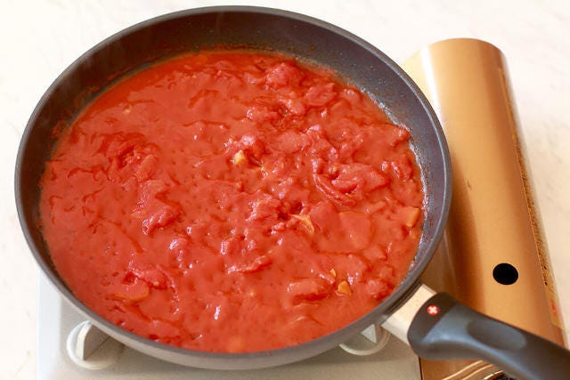 ⑨ アサリとエビを取り出し、トマト水煮を加えて水気が半分になるまで中火で煮詰める。