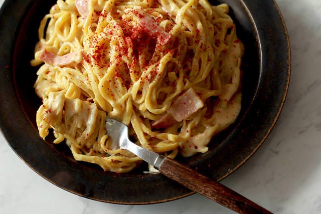 カレースパイスを練りこんだパスタで作る「カルボナーラ」のレシピ。モチモチ食感のパスタを噛むたびに、フワッと広がるカレーの香りとチーズの濃厚なコクがたまらない。ここに韓国唐辛子のパンチを加えることで、濃厚さとスパイシーさをあわせ持った絶妙な味わいになる。