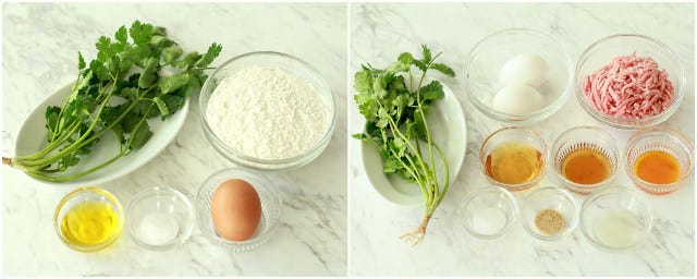 ・ソース用のパクチーを2cm幅に着る。半熟茹で玉子は半分に切る。