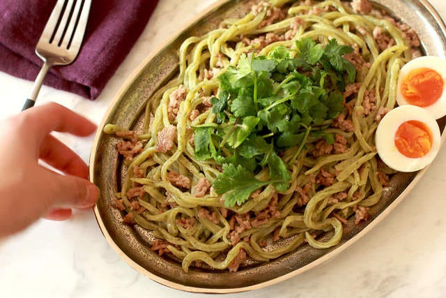 3.パクチー好きにはたまらない! 半熟茹で玉子を絡めて食べる「エスニック生パスタ」