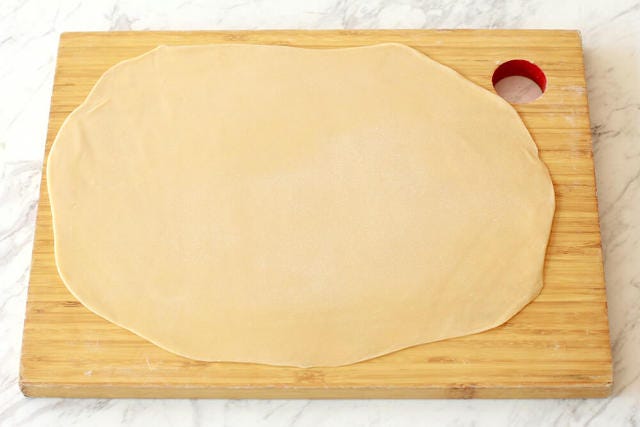 ④ 生地に打ち粉(強力粉、適量)をして厚さ1mmに伸ばす。
