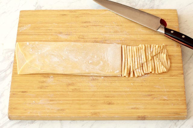 まずは基本の生パスタの作り方をご紹介。小難しい材料やパスタマシンのような特別な道具は必要なく、身近な材料4つで作ることができる。麺を切る際には、充分に打ち粉をするのが失敗しないコツ。