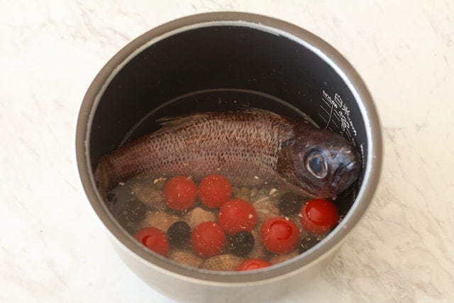 ② 炊飯器に白身魚(今回はクロムツを使用)、アサリ、ニンニク、アンチョビ、ミニトマト、ブラックオリーブ、ケイパー、コショウを入れる。