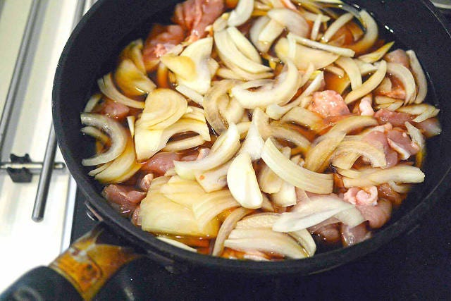 ② 冷たい状態のフライパンにAと鶏モモ肉、タマネギを入れて混ぜ、強火にかける。
