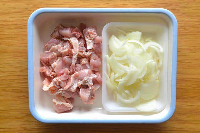 ① 鶏モモ肉を3cmほどの大きさに切る。タマネギは薄切りする。