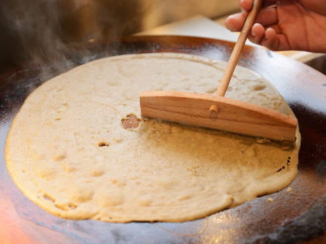 「河内鴨のガレット」は、フランスの伝統的な料理であるガレットをアレンジしたもの。一般的にガレットは水や卵、牛乳などで生地を作るが、こちらの店では蕎麦で使うだしと豆乳を加えているのがポイント。香ばしく深みのある生地を一枚ずつ丁寧に焼き上げている。