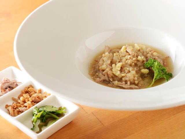「蕎麦米のリゾット」(写真上)も、こちらのお店を象徴する代表メニューのひとつ。蕎麦米(蕎麦の実100%)を、芯が残るようにあえて硬めに炊きあげているため、心地いい弾力感があり、満足感もたっぷり。この日は、生姜風味で味付けされていたが、内容はその日によって変化する。パクチーを塩昆布とゴマ油で和えたもの、鴨の脂身をフライパンでカリカリにした油かす、鴨ロースの燻製の3種の薬味が添えられて登場するので、好みでかけて味の変化を楽しみながら堪能してほしい。