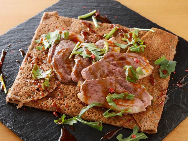 レア状態に焼き上げられたジューシーな鴨ロースを乗せて、酸味のある爽やかなオレンジソースでアクセントを添えており、どんどん箸が進んでいく。こちらの料理も日によって変わり、カマンベールチーズと鴨ささみ、クルミにハニーマスタードを絡めたものや、河内鴨のリエットとサラダをのせたものなど、ユニークなガレットを揃えている。