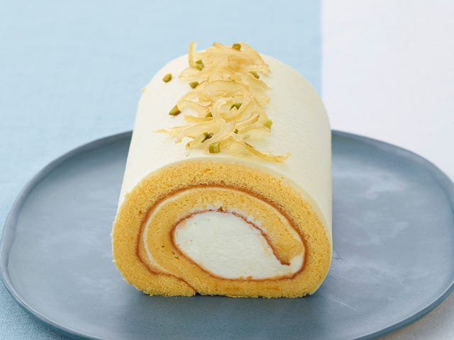 「シトラスレモンロール」は、スーッと軽やかな春の風を思わせる味わいのロールケーキ。ベルガモットピューレと練乳のクリーム、ベルガモットピューレとレモンピューレ入りのレモンカードを、レモン果皮入りのモッチリしっとりのスポンジ生地で巻き上げている。トップには、ドライレモンピューレとピスタチオが飾られ、一層爽やかな印象に。