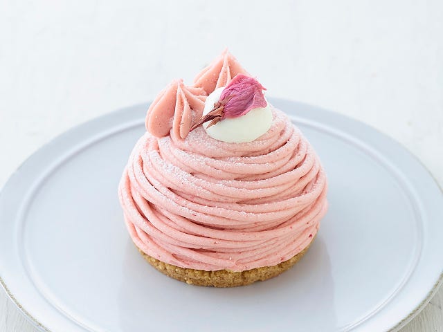 「モンブランSAKURA」は、まろやかな白餡のミルクムースに、ほんのり桜の香りのする淡いピンク色のバタークリームをたっぷりのせた、口どけの良い一品。ミルクムースの中には、梅と苺のジュレが入っており、さっぱりとした酸味を与えてくれる。土台は、桜の葉を刻んで混ぜ込んだ全粒粉のクッキー生地が入っておりザクザク食感も楽しめるモンブランだ。