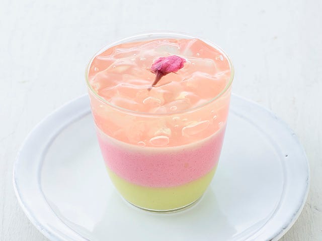 「ベリーヌSAKURA」は、ピンク色と淡い緑色で桜の木を表現した3層が美しいグラスデザート。ピスタチオのムースに、桜の花と葉の塩漬けペーストを加えたチェリームースを重ね、そして、白ワインをベースに、桜と蜂蜜がほんのり香るジュレが乗った一品。