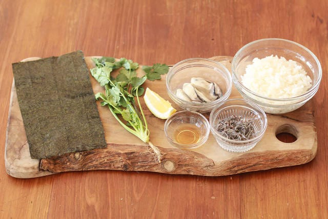 ① 焼き海苔は小さくちぎる。パクチーは1cm幅に切る。