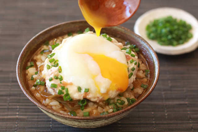 ③ 器にご飯を盛って②をかけ、①の山芋と温泉卵をのせたら青ネギを散らす。