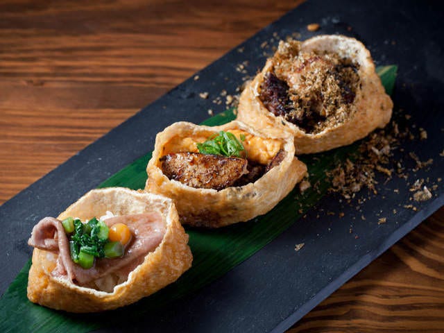 2016年11月22日(火)にオープンした『あげまき』は、食材にこだわる本格創作料理が楽しめる居酒屋だ。スペシャリテは、店名にもなっている「あげ=いなり寿司、まき=巻き寿司」。寿司の中ではカジュアルなこの2品を、フォワグラ、ウニ、和牛などを使って贅沢に仕立てる。