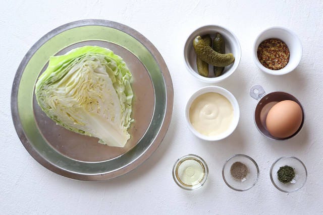 ① キャベツを半分に、ピクルス、ゆで卵はみじん切りにする。