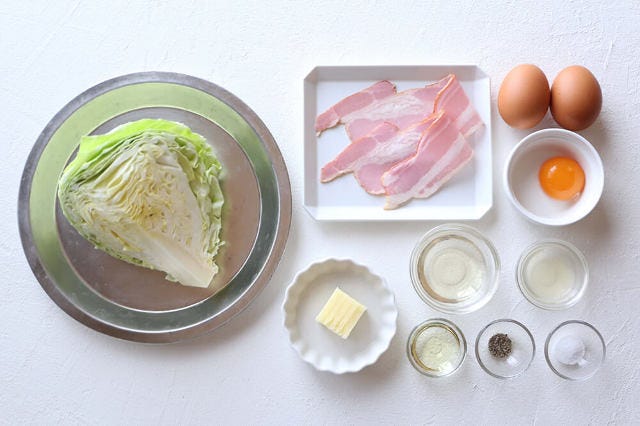 ④ フライパンを熱し、サラダ油をひき、ベーコンをこんがりと焼いて取り出す。同じフライパンでキャベツに焼き色がつくまでフタをして弱火で両面焼く。