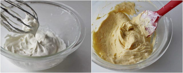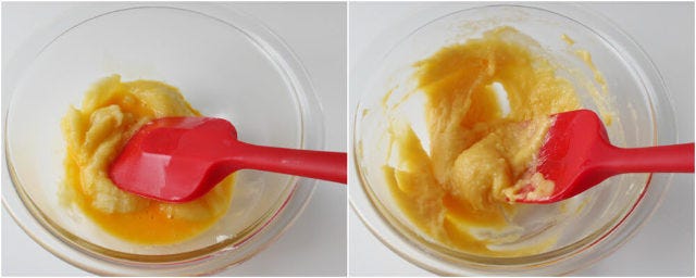 ⑥ 残り3/2の全卵を少しずつ加えて手早く混ぜる。