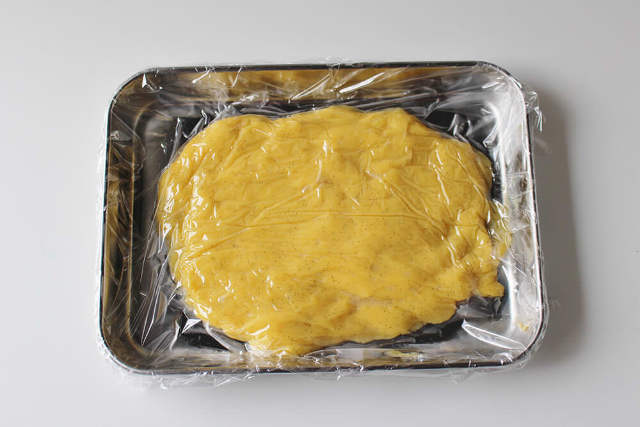 ⑦ 平らな容器に移し、クリームの表面にピッタリとラップを掛け、冷蔵庫で冷やす。