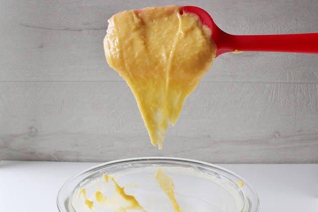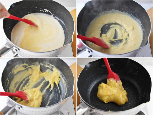 ⑦ 下の写真のように、ヘラからゆっくりと生地が落ちて三角形で残るくらいの固さになったら、素早く絞り袋に入れる。