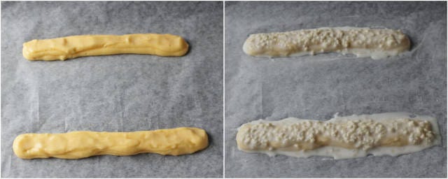 ⑧ クッキングシートを敷いた天板に幅2センチ×長さ20センチくらいにシュー生地を絞り出す。上からクランチ生地をスプーンでかけ、190度のオーブンで20分焼いたあと、さらに170度で20分焼く。