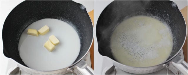 ② 小鍋にAを入れ、弱火にかけ、バターが完全に溶けて沸騰するまで待つ。