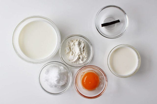 ① バニラビーンズはさやに切れこみを入れ、中の種をしごき出す。小鍋に牛乳とバニラビーンズの種とさやを入れ、フツフツとするまで弱火にかける。