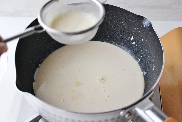 ③ ②が沸騰したら火を消し、ふるった小麦粉を一気に入れる。粉っぽさがなくなるまで手早く混ぜる。
