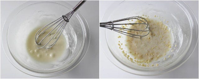 ③ ②にふるった薄力粉を入れ、粉っぽさが消えるまでよく混ぜる。