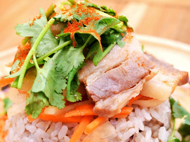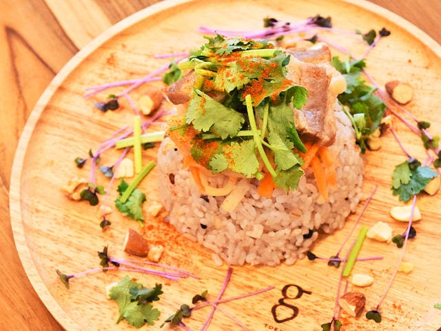 「本日のライス」は、エスニックポークライス。ベトナムのバインミーのライス版だ。甘辛な豚バラ肉に、大根とニンジンのなます、パクチーが盛られている。周囲には、レッドキャベツスプラウトやアーモンド、カシューナッツがブーケのように散りばめられ、見た目の華やかさに胃も喜ぶ。