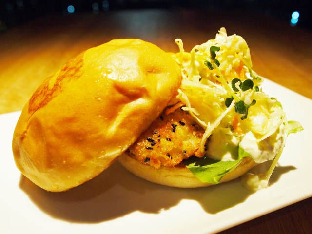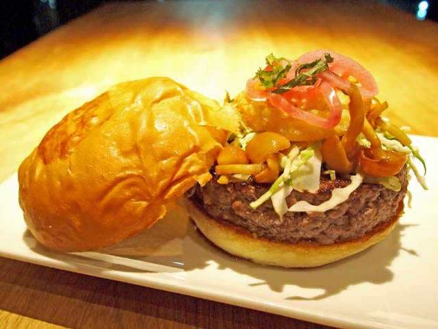 日本上陸を記念して生まれた日本限定のメニューもある。それが写真上の「サムライバーガー」。たまり醤油をベースにした甘口のテリヤキソースを絡めたパテに、レンコンの天ぷらとナメコを一緒に挟んだ日本らしい食材を使った一品だ。さらに大葉、キャベツ、レッドオニオンのピクルスが入って、さっぱりとしたあと味を生み出してくれる。レンコンの天ぷらは、衣にクラフトビールを加えており、香り豊かでふわふわサクサクの食感。これだけでも十分においしいのだが、これをバーガーに挟むことでジューシーなパテとシャキシャキした食感の両方を味わえる。ハンバーガーを超えて、一つの創作料理として楽しめる。