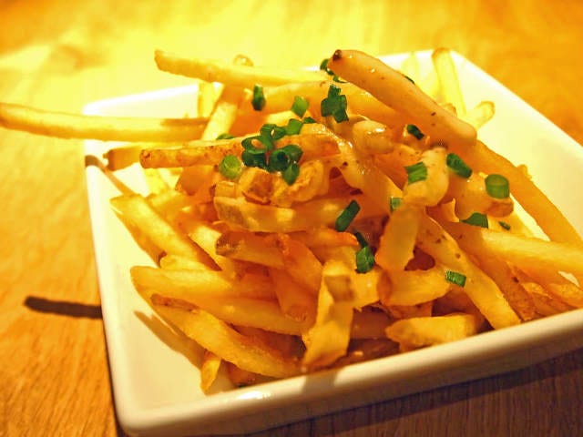 こちらはサイドメニューの「トリュフフライ」(写真上)。細くカットしたポテトにトリュフとチェダーチーズを合わせたトリュフチーズソースがたっぷりかかっている。濃厚なチーズが熱々のポテトに絡み合い、ひと口食べるとトリュフの香りが鼻を抜ける。サイドメニューもうま味を存分に味わえる内容となっている。