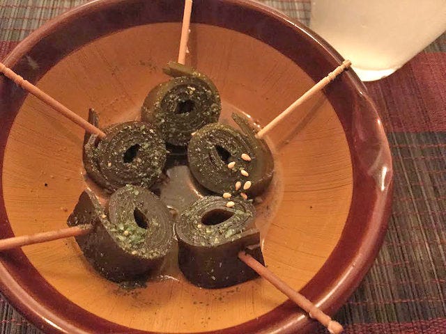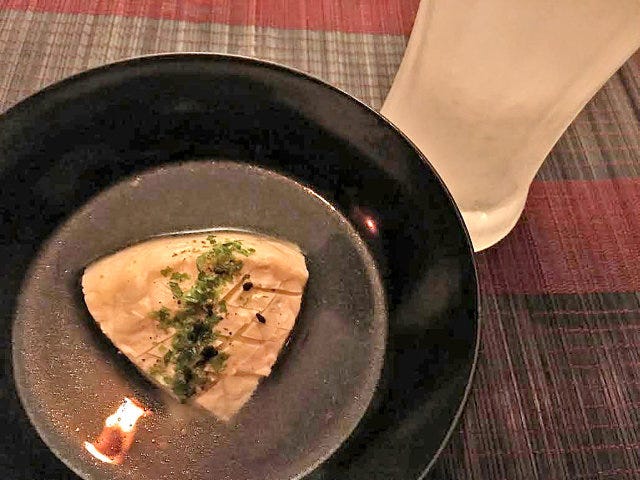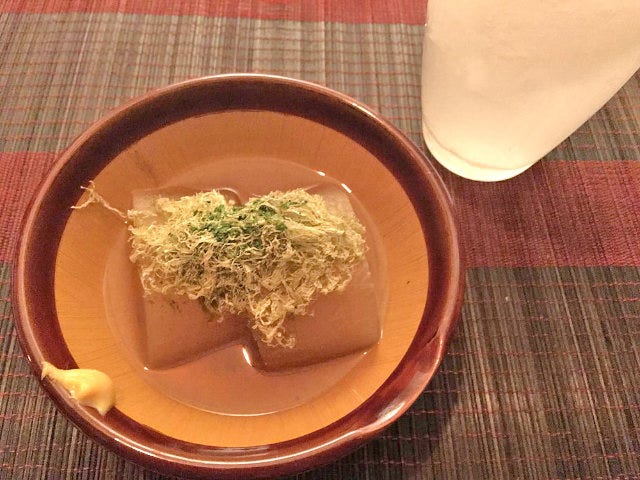 〆にはおでん屋ならではの、とうめしもある。おでんのだしで炊いたご飯に山椒豆腐をのっけてガパオのように和えて食べると、身も心もだんだん軽く温かくなって行くのが分かる。その瞬間こそ、『でんやふじさわ』にしかない緩やかで自在な夜に違いない。