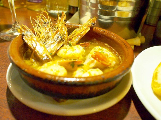 エビのアヒージョは土鍋を鉄板で熱くしてそこにエビを入れるのだが、頭の部分は鉄板で上から重しを載せてカリカリに焼いて土鍋の端に置かれて出てくる。