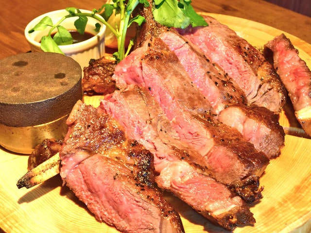 ビールに合うのはやっぱり肉! ということで、肉料理のメニューも充実。名物は17種類もある生ウインナーと生フランクだが、イチオシは最近人気を集めている「トマホーク」(写真上)という骨付きリブロースだ。迫力の見た目のエイジングビーフとクラフトビールとの相性を楽しみたい。