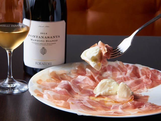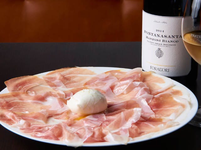 プロシュートの中央には、しっとりと水気を湛えた白磁色が美しいカンパーニャ州産の水牛モッツァレラ。カットすると切り口から乳清が溢れ出し、その味わいはクリーミーでジューシー。まずはオリーブオイルをたっぷりかけてそのまま、次はプロシュートとともに堪能しよう。