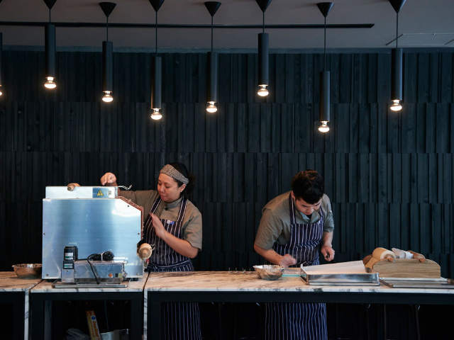 ランチタイムには、ダイニングエリアの一角にある大理石のカウンターで、スタッフが手早くパスタを打ったり、パンを仕込んだりする姿を見ることができる。「今作っているそのパスタは何?」などと話しかけられるのも大歓迎とのこと。ぜひ声をかけてみて。