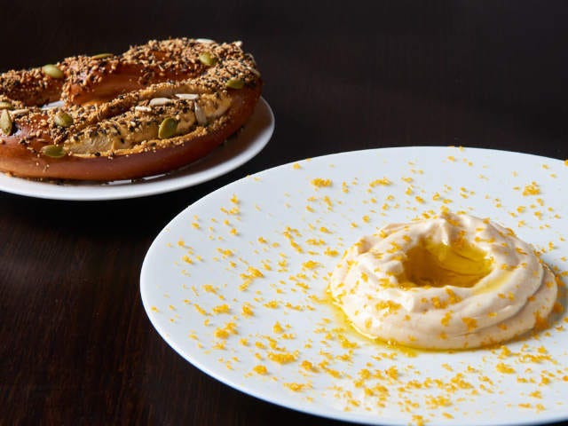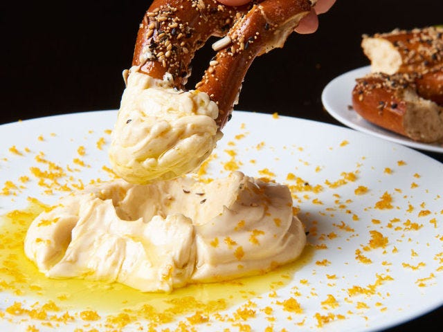 次に紹介するのは、クセになる前菜「ボッタルガクリーム プレッツェル」。一見フムスのようにも見えるこのカラスミ入りのクリームは、全粒粉のパン粉をつなぎに、スライスしたカラスミと燻製オイルを合わせてゆっくりと撹拌し、ペースト状にしたものだ。まるでミモザの花のように散りばめられたカラスミの美しさもさることながら、一体どんな味なのか想像がつかないことにワクワクするではないか!