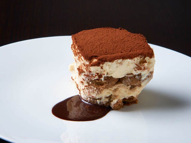 締めには、イタリアの伝統的スイーツ「ティラミス」のチョコレートソース添えを。軽めながらスポンジ部分がしっかりと厚く、マスカルポーネとココアパウダーなど古典レシピを再現した味わいが絶妙。食事の後でもぺろっと食べることができる。。