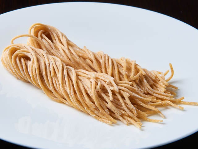 『フラテリパラディソ』のパスタはすべて自家製の手打ち麺。「パスタスカンピ」に使われているのは、「キタッラ」と呼ばれるロングパスタだ。中力粉と卵黄、全粒粉を使っているため、もっちりとした弾力があり、エビのだしがたっぷりときいた濃厚なトマトソースにも負けない力強い味わい。
