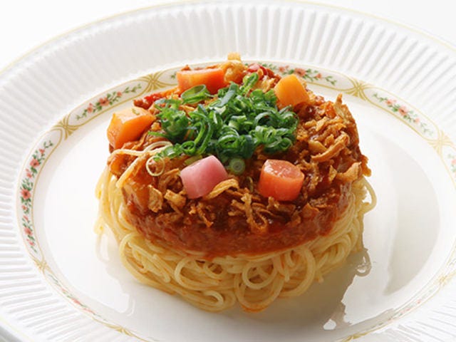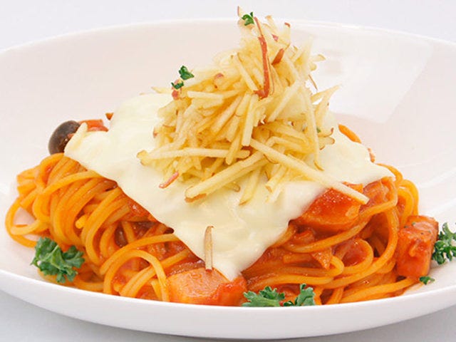 リンゴで有名な長野県安曇野市にある『食事処 美里』からは、リンゴを使ったスイーツ風ナポリタンが登場! 「安曇野林檎ナポリタン」は、リンゴバター、紅玉ジャム、シナモン、千切りにした安曇野産林檎とモッツァレラチーズを混ぜて味わう超個性派の一品だ。