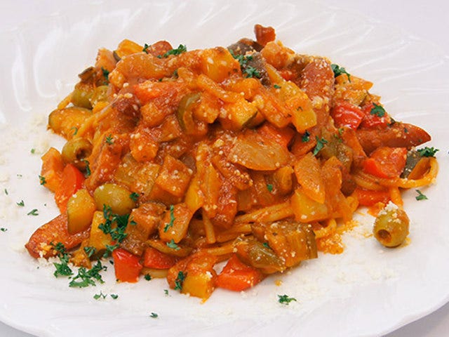 石川県河北郡『洋食とデザートのお店 ミエル』の「能登の食材を煮込んだミートソース版ナポリタン」は、能登の食材を煮込んだミートソースベースのナポリタン。色とりどりの能登野菜は食感も楽しめる。