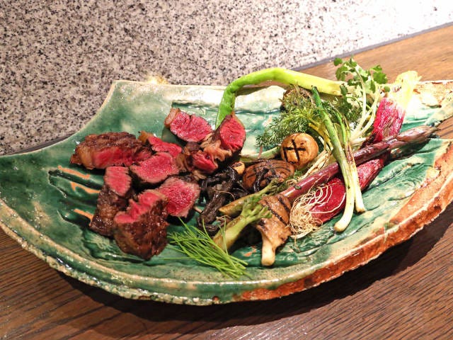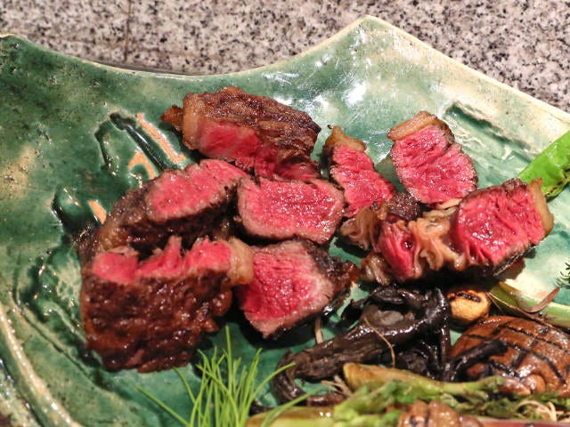 メインは「熊本阿蘇・産山村、井さんのジャージー牛 阿蘇小国牛」(写真上)。阿蘇小国牛は、阿蘇の大地でのびのびと育ったおいしい赤身が特徴のブランド牛だ。阿蘇郡産山村で暮らす井信行さん(81)が60年以上昔ながらの方法で育てており、放牧を主体とし、与える餌は自家製の飼料米や阿蘇のおからなど地元産、水も近くの湧き水を与えているという。