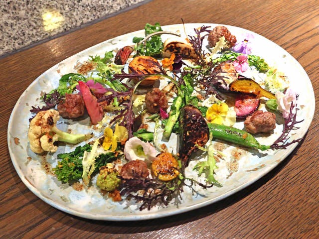 また野菜は、千葉県の農家から取り寄せた有機野菜。素焼きされた人参、ナス、スナックエンドウ、カリフラワーには、焦がしアンチョビバターのソースがちりばめられており、香ばしい香りとアンチョビバターの濃厚なソースが野菜に絡んでさらにおいしさが増していく。
