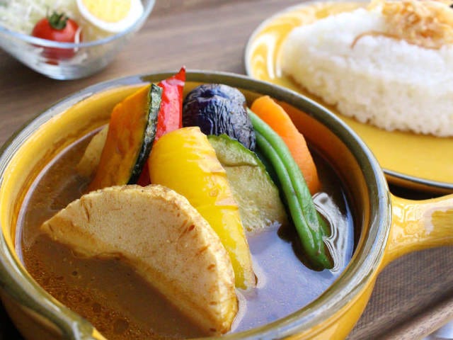 続いて、女性に人気なのは9種類の野菜を素揚げした「野菜カリー」(写真上)。ジャガイモ、ニンジン、インゲンに加えて、ナスやタケノコ、カボチャなどがトッピングされている。