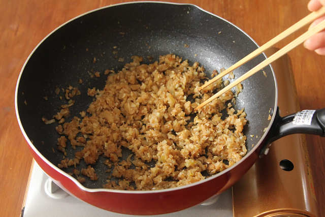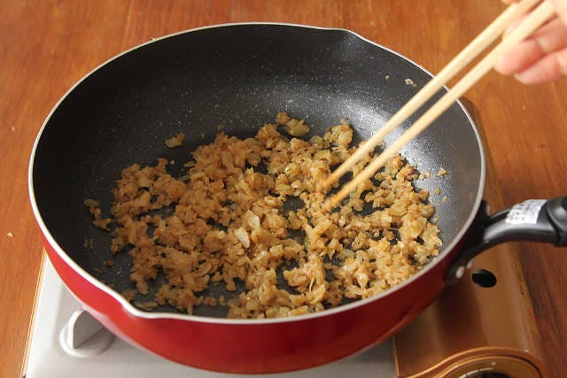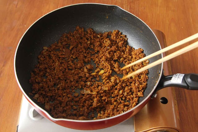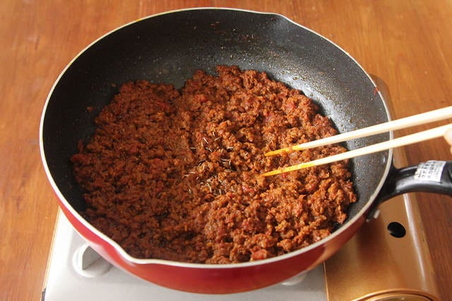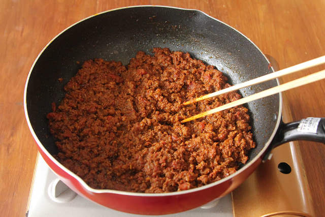 ⑤ 合挽き肉を加えて色が変わるまで炒めたら、トマト水煮、醤油を加えて水気が少なくなるまで煮る。
