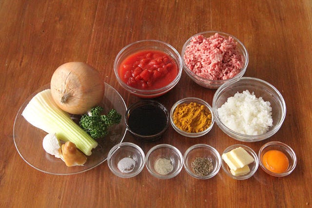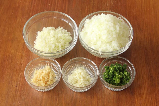 ① タマネギ、セロリ、ニンニク、ショウガ、パセリはみじん切りする。