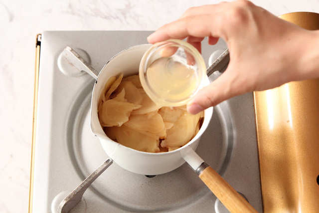 ベージュに近い色味の新生姜だが、レモン汁を入れると写真のように綺麗なピンク色に染まる。調理の途中、色が変わっていく瞬間もぜひ楽しんでほしい。