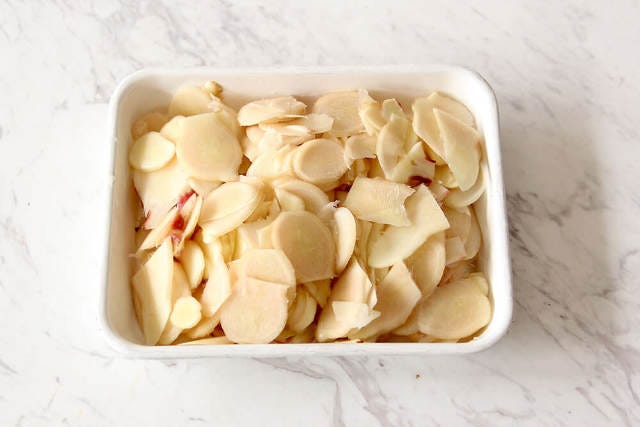 ① 新生姜は水洗いし、皮は剥かずに薄切りする。