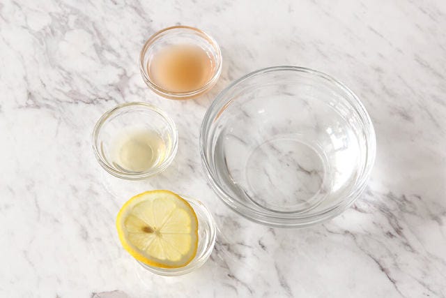 ① 鍋に水、レモン汁を入れて中火であたためる。