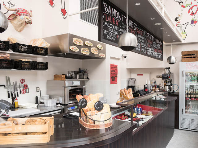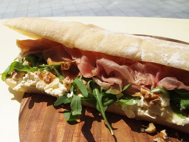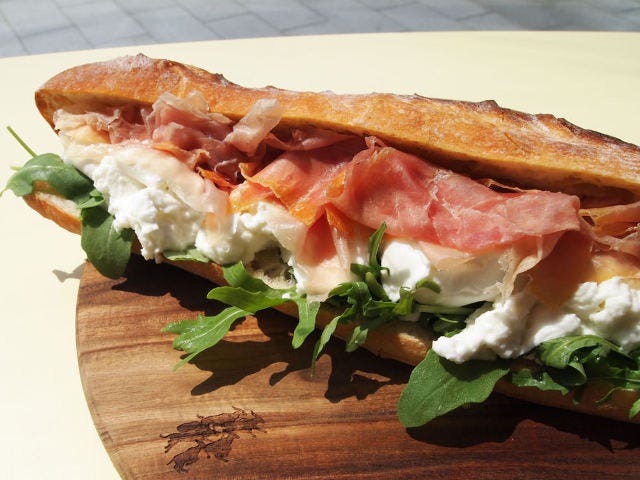 写真は、定番のバゲットで水牛のモッツァレラチーズとシャルキュトリー(ハムなどの加工肉)等を挟んだもの。オーダーを受けてから、バケットをリヒートし、その間にイタリア産のシャルキュトリーがスライサーでスライスされる。そして少し温かいバゲットに、オリーブオイルをたっぷり染み込ませ、水牛のモッツァレラ、スライスしたばかりのシャルキュトリー、フレッシュなルッコラをふんだんにサンド。具材をたっぷり挟んでくれるので、パンからはみ出しそうな見た目も食欲をそそる。